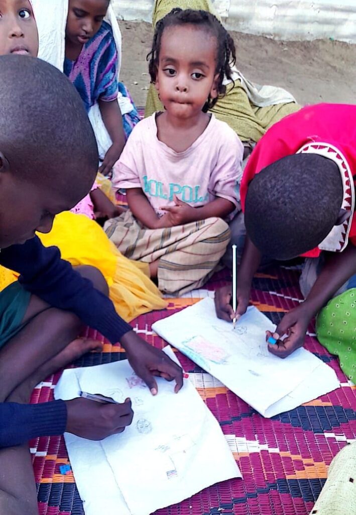 We provide psychosocial support to children through playing activities and Art at the Child-Friendly-Space (CFS).